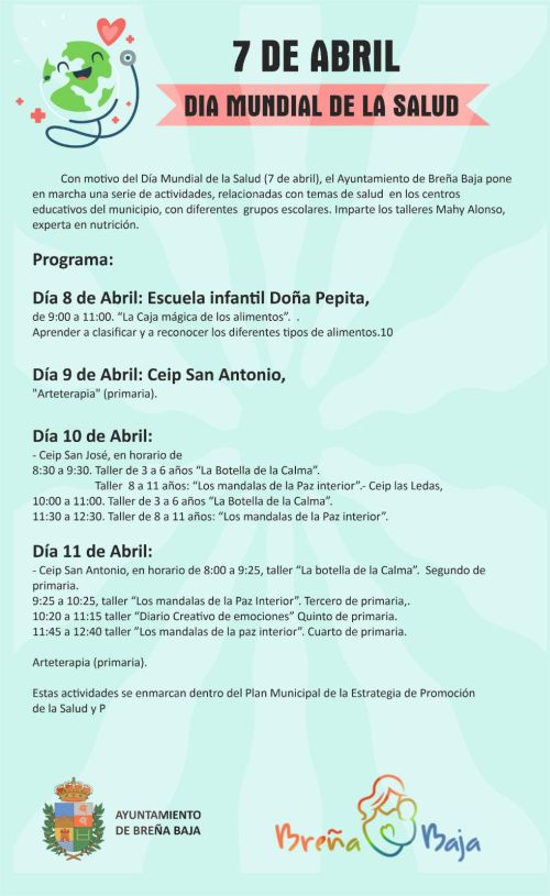 Con motivo del Día Mundial de la Salud (7 de abril), el Ayuntamiento de Breña Baja pone en marcha una serie de actividades, relacionadas con temas de salud en los centros educativos del municipio, con diferentes grupos escolares. Imparte los talleres Mahy Alonso, experta en nutrición.