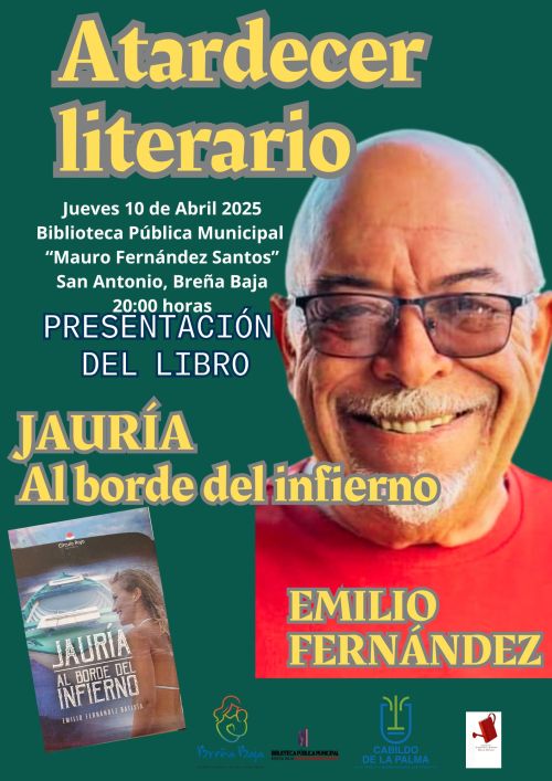 El jueves 10 de abril, a las 19 hs, en la Biblioteca Pública Municipal “Mauro Fernández Santos” de San Antonio se celebra un Atardecer Literario con Emilio Fernández, presentando su nuevo libro "Jauría al borde del infierno". Organiza la Concejalía de Cultura del Ayuntamiento de Breña Baja.