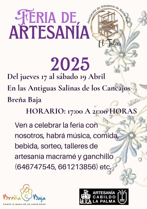 Del 17 al 19 de abril de 17 a 21 hs, en las Antiguas Salinas de Los Cancajos tendrá lugar una especial Feria de Artesanía con ocasión de las vacaciones de Semana Santa que organizan la Asociación de Artesanos "El Telar" de Breña Baja y la Concejalía de Artesanía del Ayuntamiento de Breña Baja. Con la colaboración de la Consejería de Artesanía del Cabildo Insular de La Palma.