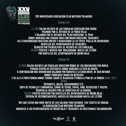 El fin de semana del 25 y 26 de abril la Asociación Club “Moteros Palmeros” celebran su XXV Aniversario con varios actos en la zona del Charco del Lino de Los Cancajos, donde se congregará a moteros de todas las islas, con actividades como rutas por la isla, comidas y conciertos.