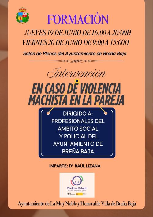 El Ayuntamiento de Breña Baja organiza unas sesiones de formación dirigido a profesionales del ámbito de los servicios sociales y policial del propio ayuntamiento con la intervención “En caso de violencia machista en la pareja” los días 19 y 20 de junio en horario de 16 a 20 hs y de 9 a 15 hs respectivamente.