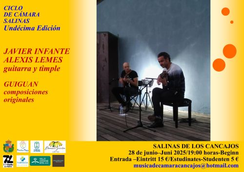 El sábado 28 de junio a las 19 hs, tendrá lugar el undécimo concierto de la Undécima Edición del Ciclo de Cámara “Salinas” en Las Antiguas Salinas de Los Cancajos, con la actuación de Javier Infante y Alexís Lemes a la guitarra y el timple con el Concierto “Guiguan, composiciones originales”.