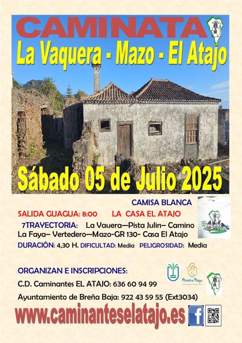 El sábado 5 de julio, el C. D. de Caminantes "El Atajo" y la Concejalía de Deportes del Ayuntamiento de Breña Baja organizan, dentro del Programa de Senderismo de Breña Baja, la caminata nº 938 "La Vaquera - Casa El Atajo".