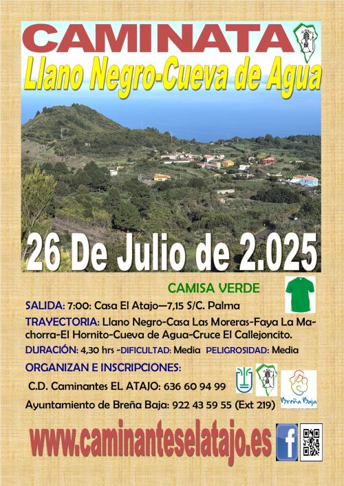 El sábado 26 de julio, el C. D. de Caminantes "El Atajo" y la Concejalía de Deportes del Ayuntamiento de Breña Baja organizan, dentro del Programa de Senderismo de Breña Baja, la caminata nº 940 "Llano Negro - Cueva del Agua" en el municipio de la Villa de Garafía.