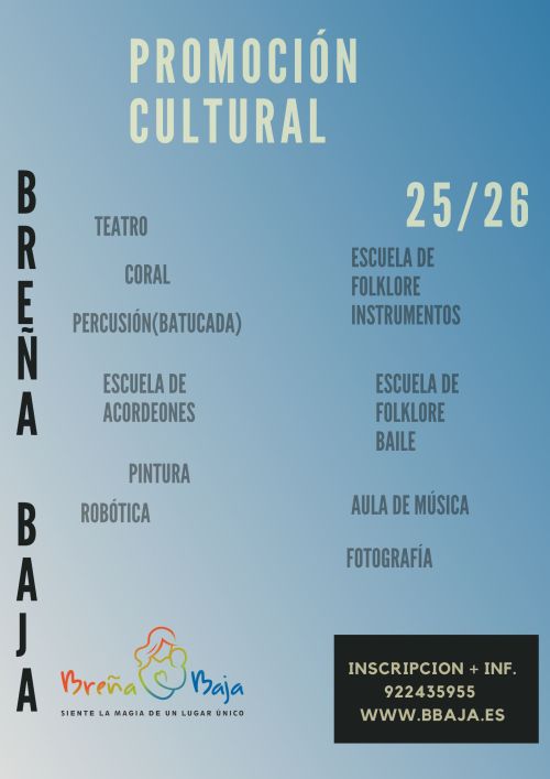 La Concejalía de Cultura del Ayuntamiento de Breña Baja abre el periodo de inscripciones para las actividades de promoción cultural 2025-2026 que se desarrollarán en el municipio desde el mes de octubre 2025 hasta junio de 2026, para todas las edades a partir de 5 años (en la mayoría de las actividades).