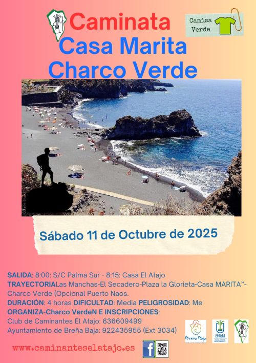 El sábado 11 de octubre, el C. D. de Caminantes "El Atajo" y la Concejalía de Deportes del Ayuntamiento de Breña Baja organizan, dentro del Programa de Senderismo de Breña Baja, la caminata nº 958 "Casa Marita - Charco Verde", en Los Llanos de Aridane.