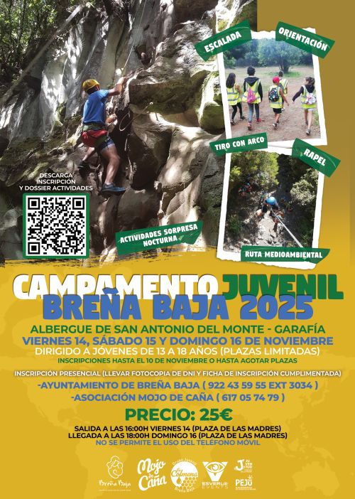 Bajo el nombre de “Breña Baja Juventud”, el campamento contara con una programación medioambiental, deportiva y de ocio saludable donde habrán talleres, dinámicas, juegos, actividades de multiaventura, carrera de orientación, rápel (descenso de un barranco de varios saltos), tirolina, iniciación a la escalada, escala de troncos, paseo nocturno “la noche en el monte”…