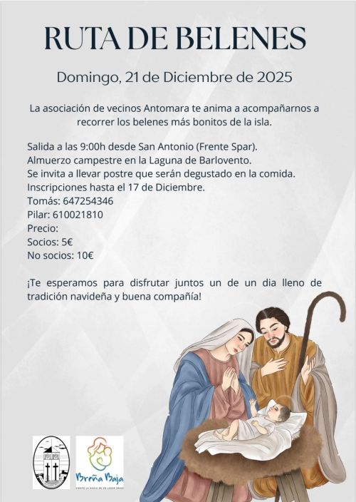 El fin de semana del 20 y 21 de diciembre las asociaciones de vecinos “El Socorro” y “Antomara” de San Antonio organizan sendas excursiones y visitas a Los Belenes de la isla. Cuentan con la colaboración del Ayuntamiento de Breña Baja.