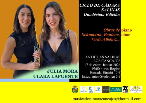 De esta manera, el sábado 17 de enero, a las 19 hs Julia Mora y Clara Lafuente, piano y oboe, formando un dúo de sonoridad limpia y de proximidad con el público. En el caso de Julia Mora, ya ha actuado en otras ediciones de los Ciclos Salinas y Eustaquio Sicilia en las Salinas.