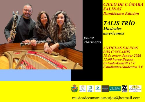 Por su parte, el domingo 18 de enero a las 12 hs, TALIS TRÍO, se adentra en los musicales norteamericanos. Un conjunto integrado por Noemí Salomón (Piano), Laura Sanchez (Clarinete) y Samuel Hernández (Clarinete). Naturales de Tenerife, Galicia y Gran Canaria.