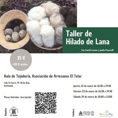 La Asociación de Artesanos "El Telar" de Breña Baja organiza un taller de “Hilado de Lana” en el Aula de Tejeduría en El Fuerte. Colaboran la Concejalía de Artesanía del Ayuntamiento de Breña Baja y Consejería de Artersanía del Cabildo Insular de La Palma. Plazas limitadas.