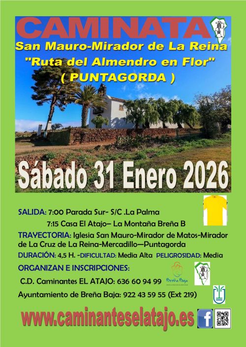EL ATAJO, organiza una caminata para el sábado 31 de enero “San Mauro – Mirador de la Reina” (Municipio de Puntagorda) recorriendo los almendros en flor y visitando a su termino la Fiesta del Almendro en Flor. Salida a las 7.15 hs. de la Casa El Atajo (La Montaña) e inscripciones: 636 60 94 99 (Gilberto).