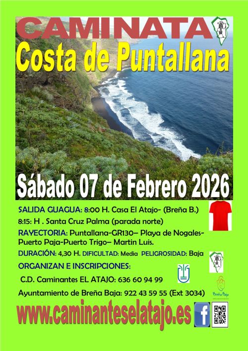 El sábado 7 de febrero, el C. D. de Caminantes "El Atajo" y la Concejalía de Deportes del Ayuntamiento de Breña Baja organizan, dentro del Programa de Senderismo de Breña Baja, la caminata nº 974 "Costa de Puntallana".