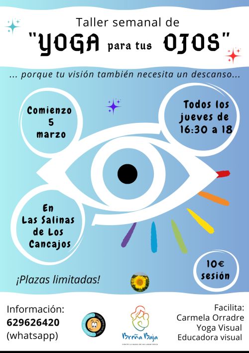 A partir del jueves 5 de marzo comienza el taller semanal “Yoga para tus ojos” en las Antiguas Salinas de Los Cancajos, todos los jueves de 16.30 a 18 hs y facilitado por Carmela Orradre. Colabora Ayuntamiento de Breña Baja.