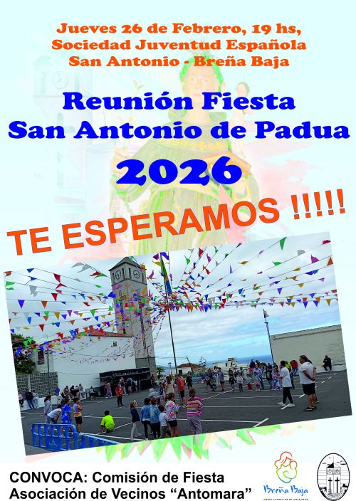 El jueves 26 de febrero, la Comisión de Fiesta de San Antonio de Padua, conjuntamente, con la Asociación de Vecinos “Antomara” de San Antonio y el Ayuntamiento de Breña Baja, convocan una reunión a las 19 hs. en la Sociedad Juventud Española de San Antonio.