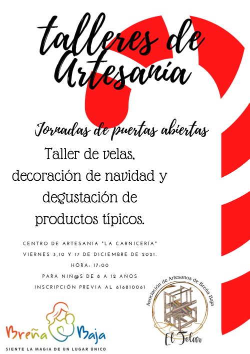 La Asociación de Artesanos "El Telar" de Breña Baja y la Concejalía de Artesanía del Ayuntamiento de Breña Baja organizan varios talleres infantiles artesanales por Navidad en el Centro de Artesanía “La Carnicería” en San José. Jornadas de puertas abiertas con degustación de productos típicos. Esta actividad se enmarca dentro del Programa de Navidad de Breña Baja 2021.