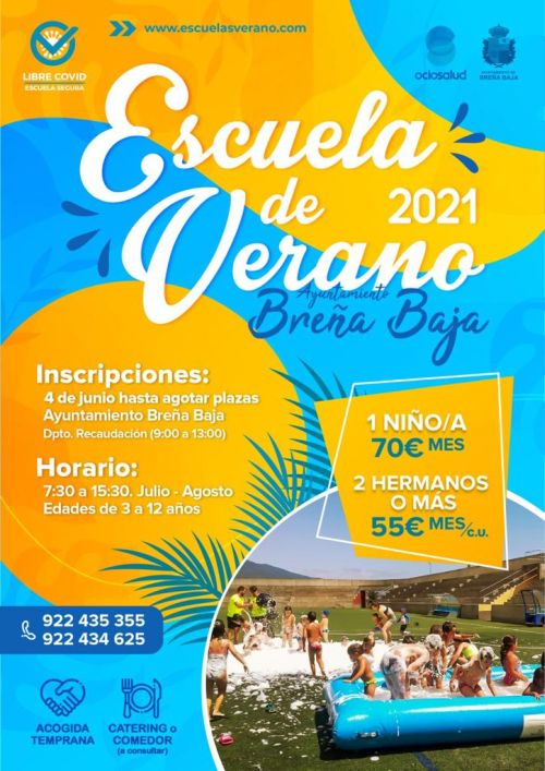 El Ayuntamiento de Breña Baja se encuentra en periodo de inscripciones para la “Escuela de Verano 2021” para niños y niñas entre 3 y 12 años, inclusive. Se realiza durante los meses de julio y agosto y se formaran grupos en función de la matricula y se ubica en el Ceip de San Antonio con horario de 7.30 a 15.30 hs. de lunes a viernes. Este año la escuela se llevara a cabo a través empresa especializada “Ocio Salud”. Contara con todas las medidas anti covid 19.