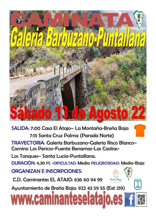 El sábado 13 de agosto, el C. D. de Caminantes "El Atajo" y la Concejalía de Deportes del Ayuntamiento de Breña Baja organizan, dentro del Programa de Senderismo de Breña Baja, la caminata nº 769: "Galería Barbuzano - Puntallana".