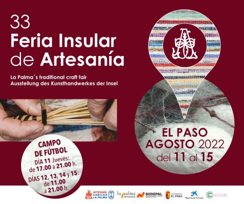 La 33º Feria Insular de Artesanía se desarrolla del 11 al 15 de agosto en el municipio de El Paso (Campo de Fútbol) con los siguientes horarios: el día 11 de 17 a 21 y del 12 al 15 de 11 a 21 hs.