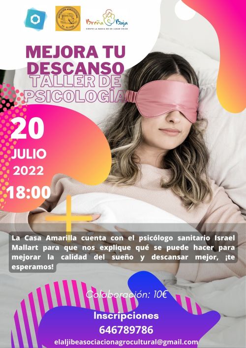 El miércoles 20 de julio a las 18.00 hs la Asociación Agrocultural “El Aljibe” organiza un Taller “Mejora tu descanso” en la Casa Amarilla de Las Ledas. Impartido por el psicólogo sanitario Israel Mallart. Se cuenta con la colaboración del Ayuntamiento de Breña Baja.