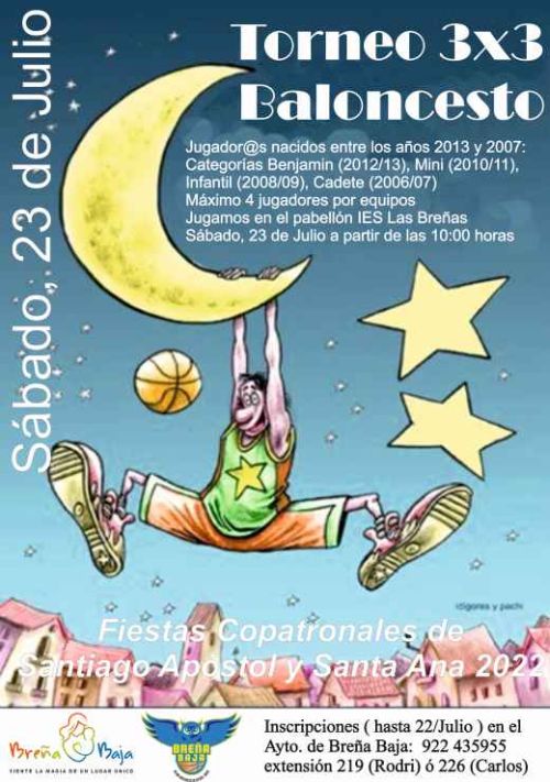 Con motivo de la Fiestas Copatronales de Santiago Apóstol y Santa Ana el Club de Baloncesto de Breña Baja, conjuntamente, con el Ayuntamiento de Breña Baja organizan un Torneo 3x3 de Baloncesto para el sábado 23 de julio en el pabellón del IES “Las Breñas”.
