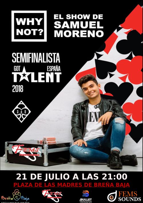 El jueves 21 de julio, a las 21 hs, el Ayuntamiento de Breña Baja y Fems Producciones presentan el show de magia “Why Not ? 2.0” de Samuel Moreno, semifinalista de Got Talent España 2018. En la Plaza de Las Madres de San José, en el marco de las Fiestas Copatronales de Santiago Apóstol y Santa Ana 2022. Entrada libre.
