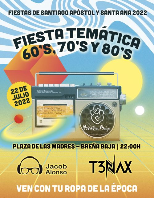 El viernes 22 de julio, 22 hs, Plaza de Las Madres de San José se organiza la Fiesta Temática de los 60s, 70s y 80s con los dj´s Jacob Alonso y Tenax por parte del Ayuntamiento de Breña Baja y con motivo de las Fiestas Copatronales de Santiago Apóstol y Santa Ana 2022. Entrada Libre.