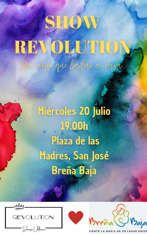 El miércoles 20 de julio, 19 h, en la Plaza de Las Madres de San José, Revolution Dance organiza el show “Que mejor que bailar en casa”, con la colaboración del Ayuntamiento de Breña Baja y dentro del programa de las Fiestas Copatronales de Santiago Apóstol y Santa Ana de este municipio.