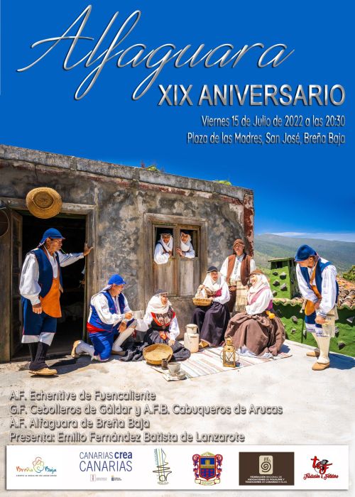 El viernes 15 de julio, 20.30 hs., la Agrupación Folklórica “Alfaguara” de Breña Baja celebra el XIX Festival Aniversario en la Plaza de Las Madres de San José con la participación de las agrupaciones folklóricas G.F. “Los Cebolleros” de Gáldar y A.F.B. “Los Cabuqueros” de Arucas de Gran Canaria; A.C.F. “Echentive” de Fuencaliente de La Palma y la propia “Alfaguara”.