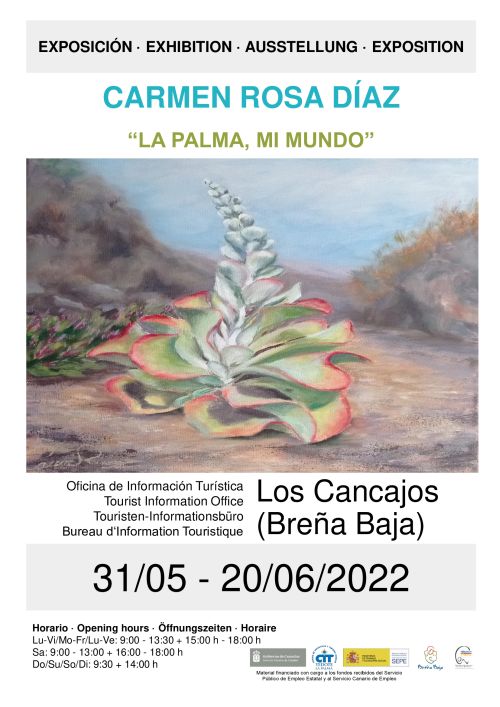 Del 31 de mayo al 20 de junio Carmen Rosa Díaz Bravo nos muestra sus obras de pintura al óleo “La Palma, mi mundo” en la Oficina de Turismo de Los Cancajos y en los horarios habituales de la oficina. Colabora Ayuntamiento de Breña Baja y CIT Tedote, entre otros.