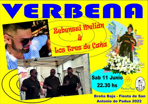 El sábado 11 de junio a las 22.30 hs. en el recinto de fiestas de San Antonio, tendrá lugar una verbena con los artistas palmeros Zebensui Melián y Los Tres de Caña. Organizan la Asociación de Vecinos “Antomara” y el Ayuntamiento de Breña Baja por la Fiesta de San Antonio de Padua 2022. Entrada Libre.