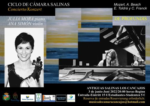 El noveno concierto de la Octava Edición del Ciclo de Cámara Salinas, tendrá lugar el viernes 3 de junio a las 20 hs en las Antiguas Salinas de Los Cancajos, bajo el titulo “De Profundis” con Julia Mora (piano) y Ana Simón (violín).