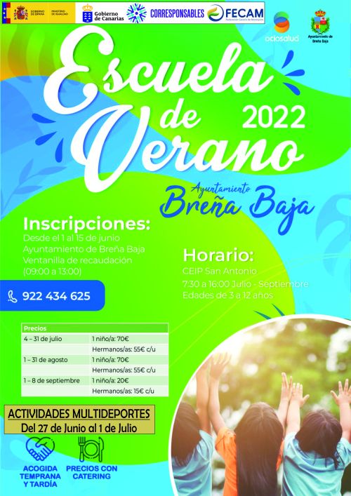 El Ayuntamiento de Breña Baja se encuentra en periodo de inscripciones tanto para el V Campus Multideportivo como para la “Escuela de Verano 2022” para niños y niñas entre 3 y 12 años, inclusive.