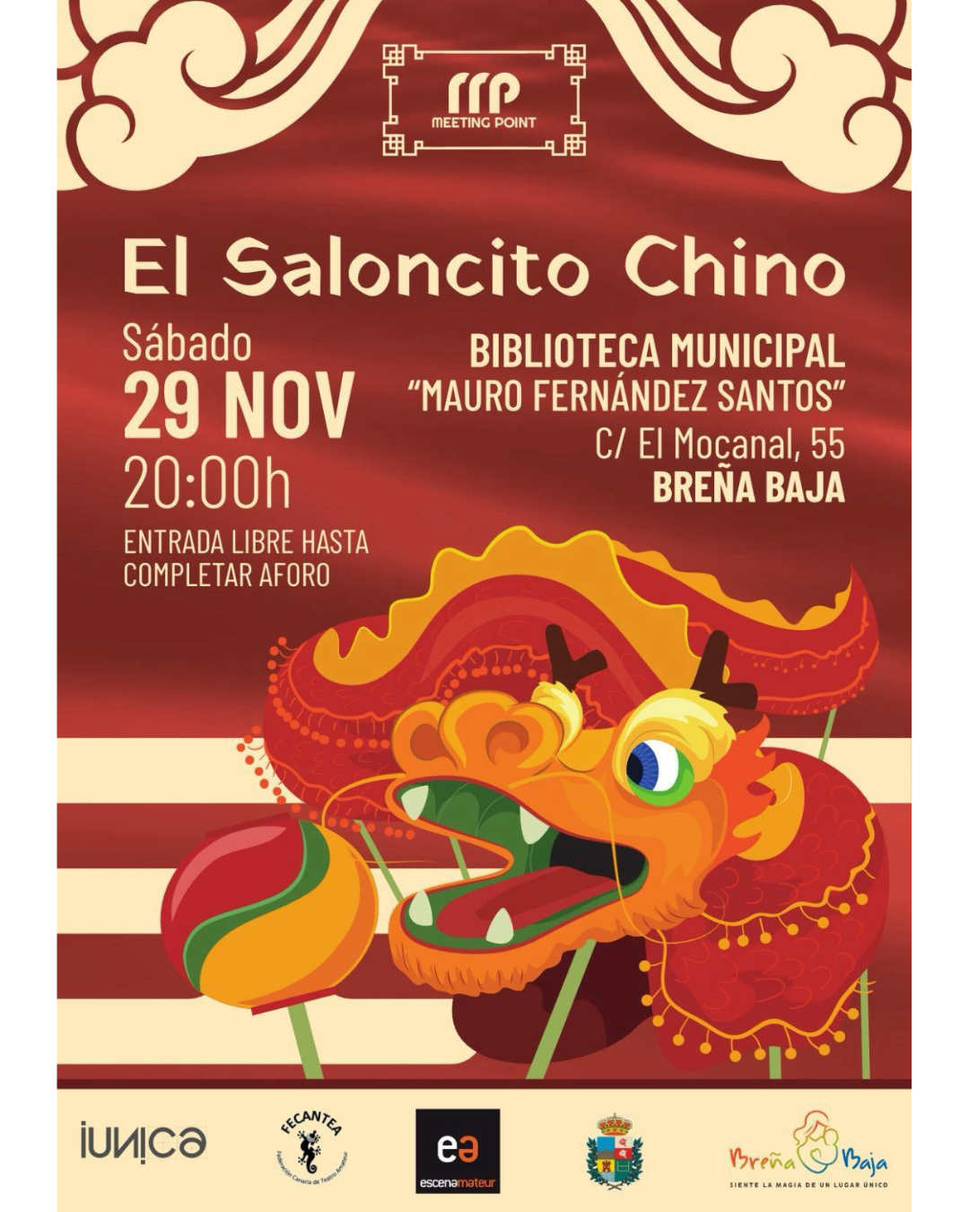 ¡Este sábado tenemos teatro en Breña Baja! La Concejalía de Cultura del Ayuntamiento de Breña Baja te invita a disfrutar de una propuesta escénica tan sorprendente como deliciosa: “El Saloncito Chino”, a cargo de la compañía Meeting Point Teatro.
