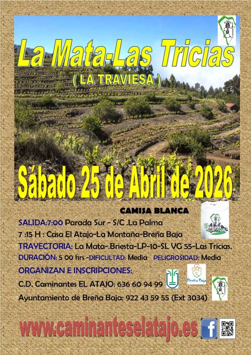 El sábado 25 de abril, el C. D. de Caminantes "El Atajo" y el Ayuntamiento de Breña Baja organizan, dentro del Programa de Senderismo de Breña Baja, la caminata nº 984: "La Mata - Las Tricias" (La Traviesa), en el municipio de la Villa de Garafía.