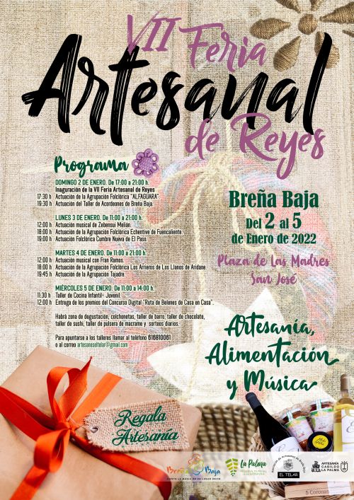 Del 2 al 5 de enero en la Plaza de Las Madres de San José tendrá lugar la “VII Feria Artesanal de Reyes 2022” que organiza el Ayuntamiento de Breña Baja, conjuntamente con la asociación artesanal “El Telar” de Breña Baja, así como con la colaboración de la Consejería de Artesanía del Cabildo Insular de La Palma y la Reserva Mundial de la Biosfera La Palma.