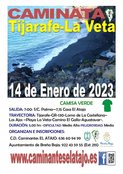 El sábado 14 de enero, el C. D. de Caminantes "El Atajo" y la Concejalía de Deportes del Ayuntamiento de Breña Baja organizan, dentro del Programa de Senderismo de Breña Baja, la caminata nº 796: "Tijarafe - Playa La Veta".