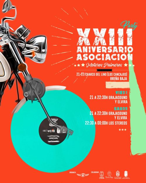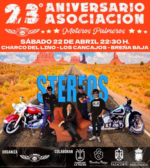 El fin de semana del 21 al 23 de abril la Asociación Club “Moteros Palmeros” celebran su XXIII Aniversario con varios actos en la zona del Charco del Lino de Los Cancajos, donde se congregará a moteros de todas las islas, con actividades como rutas por la isla, comidas y conciertos.