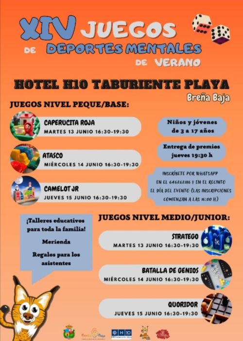 Del 13 al 15 de junio en el Hotel H10 Taburiente Playa de Los Cancajos se celebran los XIV Juegos Infantiles de Deportes Mentales de Verano. Cuentan con la colaboración del Ayuntamiento de Breña Baja y el Hotel H10 Taburiente Playa, además de recibir la colaboración de varias entidades comerciales.