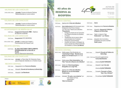 Del 26 de junio al 1 de julio en Los Cancajos, tendrá lugar los actos en conmemoración del 40 Aniversario de la Declaración de la «Finca del Canal y Los Tilos» como Reserva de la Biosfera. Se cuenta, entre otras entidades, con la colaboración del Ayuntamiento de Breña Baja.