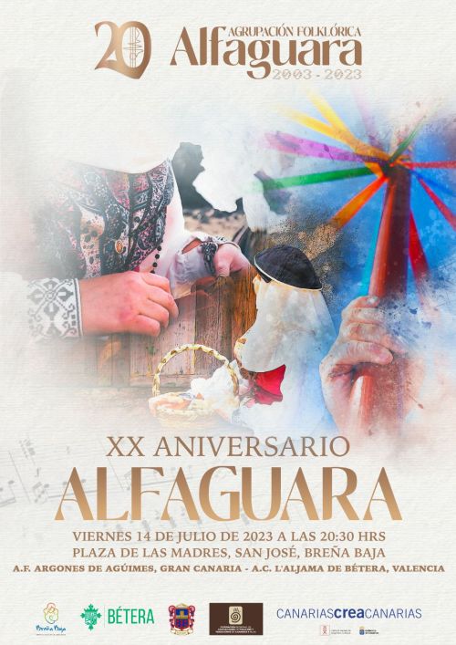 El viernes 14 de julio, 20.30 hs., la Agrupación Folklórica “Alfaguara” de Breña Baja celebra el XX Festival Aniversario en la Plaza de Las Madres de San José con la participación de la A. F. “Argones” de Agüimes (Gran Canaria), Asociación Cultural “A’ljama de Bétera” (Valencia) y la propia “Alfaguara”. Presentado por Francisco Acosta, contara con varias sorpresas.