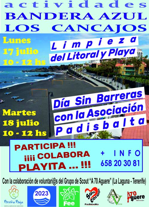 Los días 17 y 18 de julio continúan las actividades de Bandera Azul en la Playa de Los Cancajos dirigidas a la protección medioambiental y a la accesibilidad y disfrute de la playa. Organiza el Ayuntamiento de Breña Baja y se invita a la población en general a participar de las mismas.