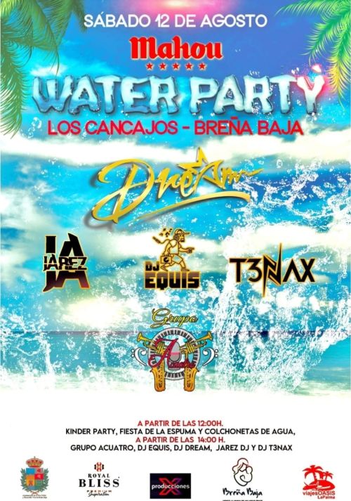El sábado 12 de agosto, de 12 a 21 hs, tendrá lugar la primera fiesta del agua MAHOU WATER PARTY 2023, en los aparcamientos de Los Cancajos. Organiza Producciones X, patrocina Cervezas Mahou y colaboran Ayuntamiento de Breña Baja, Royal Bliss y Viajes Oasis. Entrada Libre.