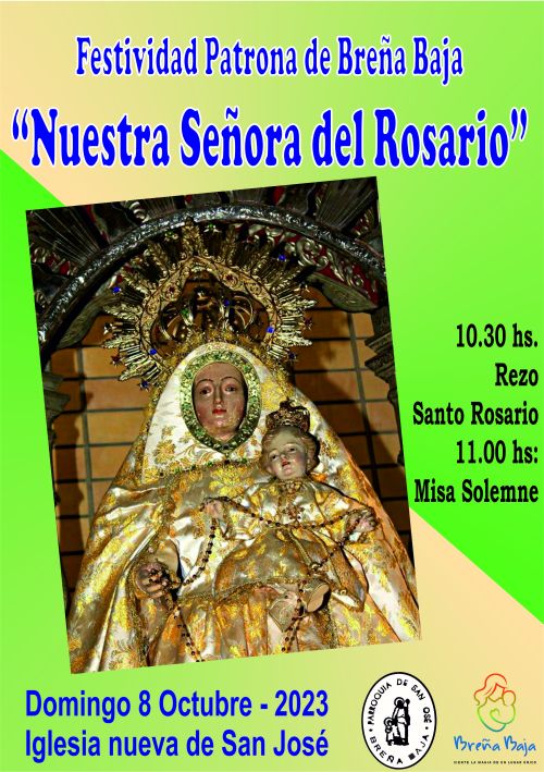 El domingo 8 de octubre tendrá lugar la celebración de la festividad de “Ntra. Sra. del Rosario”, patrona de la Villa de Breña Baja. Los actos religiosos tendrán lugar en la Iglesia nueva de San José con el rezo del Santo Rosario, 10.30 hs, y con la Misa Solemne cantada por el Coro Parroquial de San José, a las 11 hs.