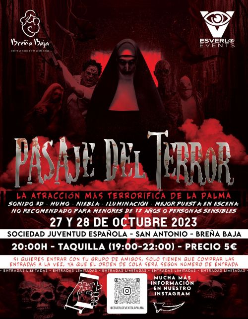 El viernes 27 y sábado 28 de octubre a las 20.00 hs. Esverlo Events presenta la séptima edición del “Pasaje del Terror”, la atracción más terrorífica de La Palma, en la Sociedad Juventud Española de San Antonio, conjuntamente con la Concejalía de Juventud del Ayuntamiento de Breña Baja.