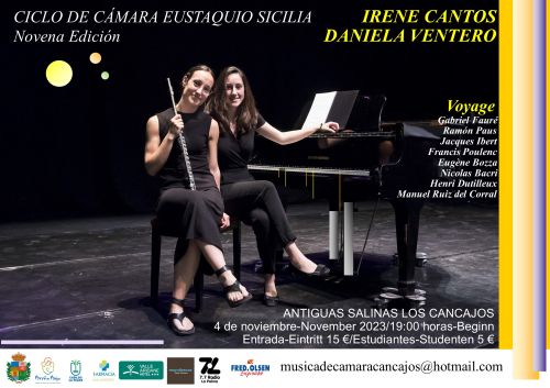 El sábado 4 de noviembre a las 19 hs, en las Antiguas Salinas de Los Cancajos tendrá lugar el quinto concierto del Ciclo de Cámara Eustaquio Sicilia en su novena edición, con un concierto de piano y flauta, Irene Cantos y Daniela Ventero, bajo el titulo “Voyage”.