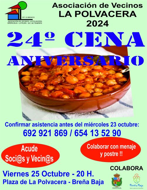 Con motivo del XXIV Aniversario, la Asociación de Vecinos "La Polvacera" de Breña Baja, celebra su Cena-Aniversario el viernes 25 de octubre a partir de las 20.00 hs. en la Plaza de La Polvacera, donde están invitados/as todos/as los/as socios/as de la asociación y vecin@s del barrio. Se cuenta con la colaboración del Ayuntamiento de Breña Baja.