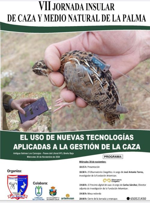 La Federación Insular de Caza de La Palma, organiza el miércoles 20 de noviembre la VII Jornada Insular de Caza y Medio Natural de La Palma, bajo el título “El uso de nuevas tecnologías aplicadas a la gestión de la caza”, en las Antiguas Salinas de Los Cancajos.