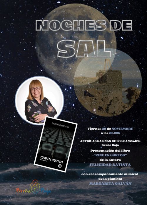 El viernes 29 de noviembre, a las 20 h, en las Antiguas Salinas de Los Cancajos, la tinerfeña Felicidad Batista presentará su libro «Cine en Cortos» en el marco de las Noches de Sal de la Concejalía de Cultura del Ayuntamiento de Breña Baja. Margarita Galván amenizará el evento con un concierto de piano.
