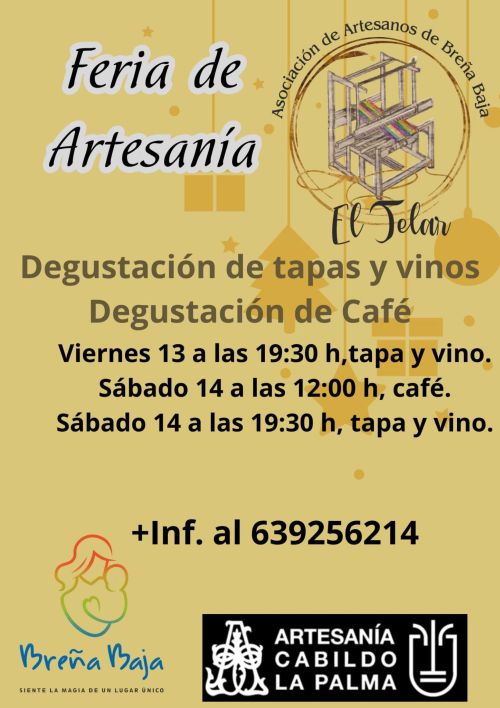 Del 12 al 14 de diciembre en la Plaza de Las Madres de San José tendrá lugar la “Feria de Artesanía” que organiza el Ayuntamiento de Breña Baja, conjuntamente con la asociación artesanal “El Telar” de Breña Baja, por estas fechas navideñas. Cuenta con la colaboración de la Consejería de Artesanía del Cabildo Insular de La Palma.